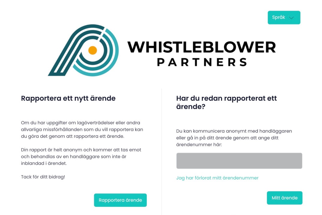 Du kommer att komma in på ett webbformulär, som du ser nedan, där du väljer Rapportera nytt ärende. Därefter kommer du in på en sida där du får beskriva ditt visselblåsarärende.
